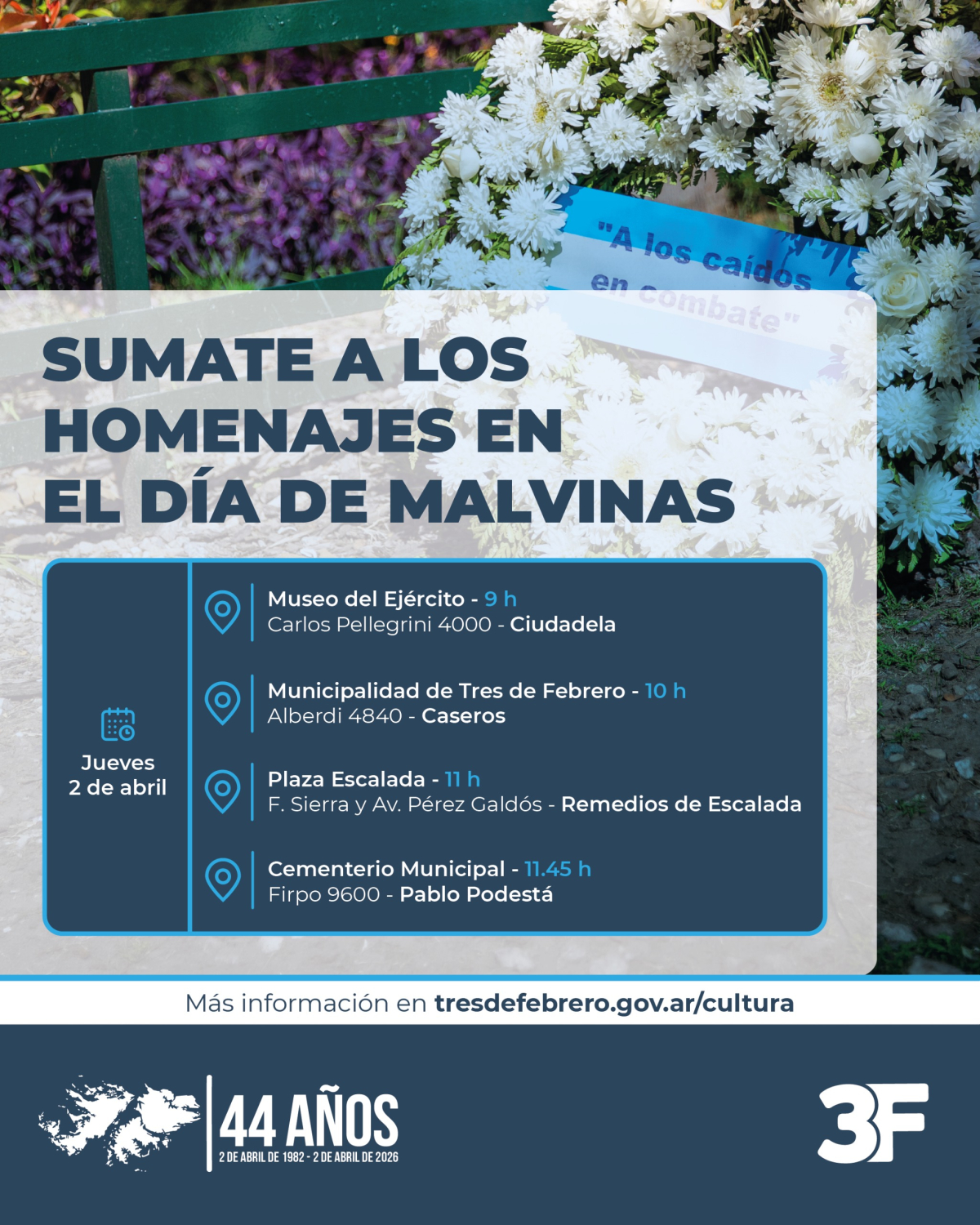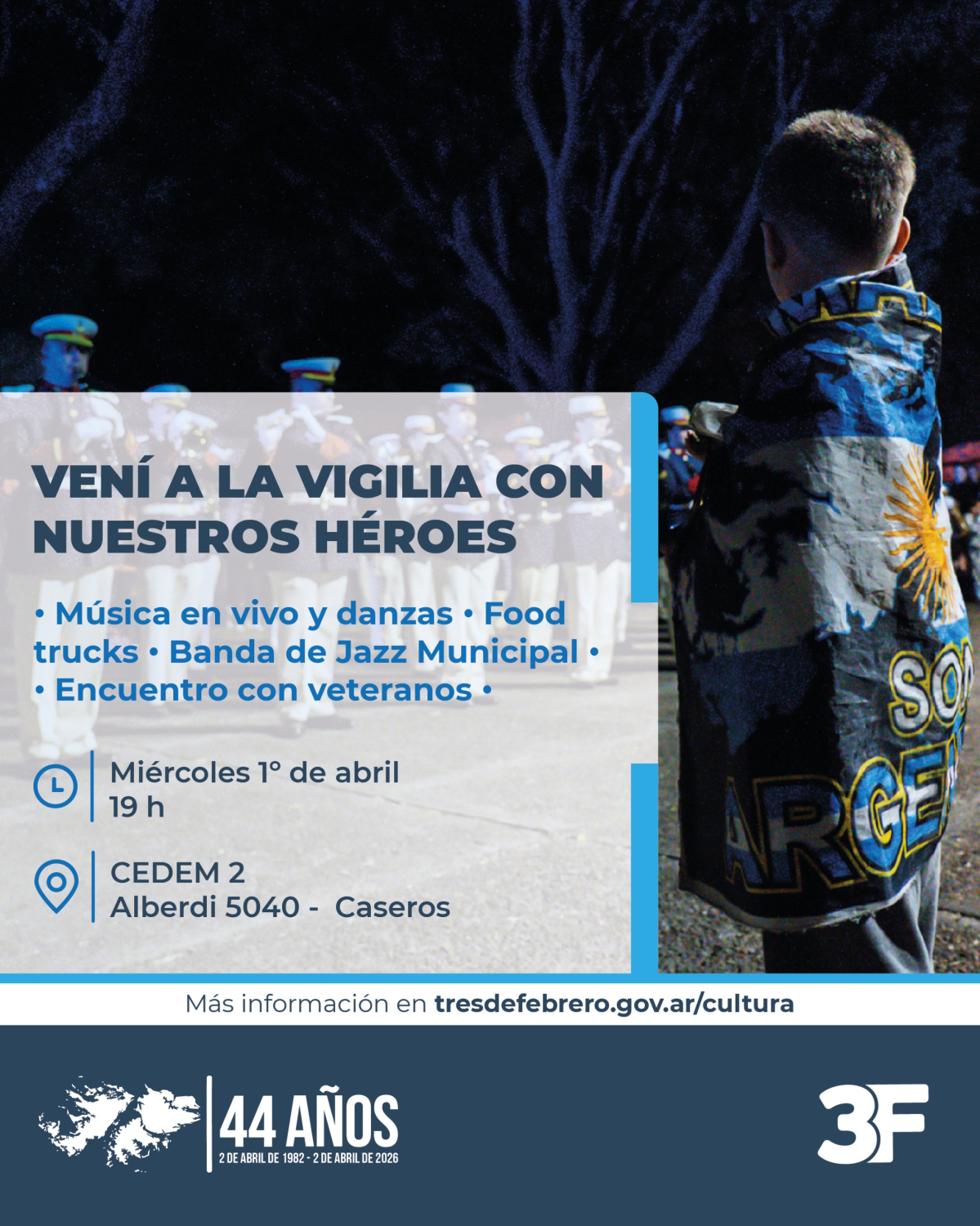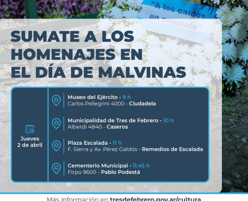 En conmemoración a los combatientes de Malvinas, te invitamos a recordarlos en familia con danzas, food trucks y la Banda de Jazz Municipal. Además, podrás escuchar el emotivo relato de nuestros veteranos. Por otro lado, el jueves 2 de octubre realizaremos homenajes en distintos puntos del distrito.