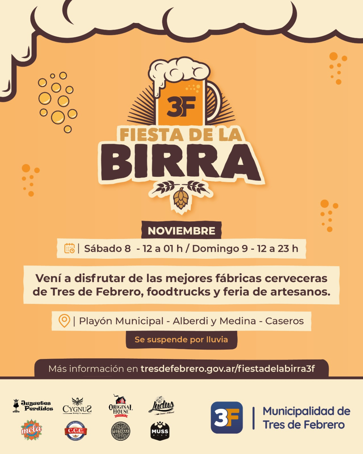 Las mejores cervecerías de Tres de Febrero, te invitan a vivir un fin de semana increíble con una nueva edición de la Fiesta de la Birra. La misma será el sábado 8 de noviembre de 12 a 00 h y domingo 9 de 12 a 23 h en el Playón Municipal (Alberdi y Medina). Además, el evento contará con diversidad de opciones gastronómicas y bandas tributo.