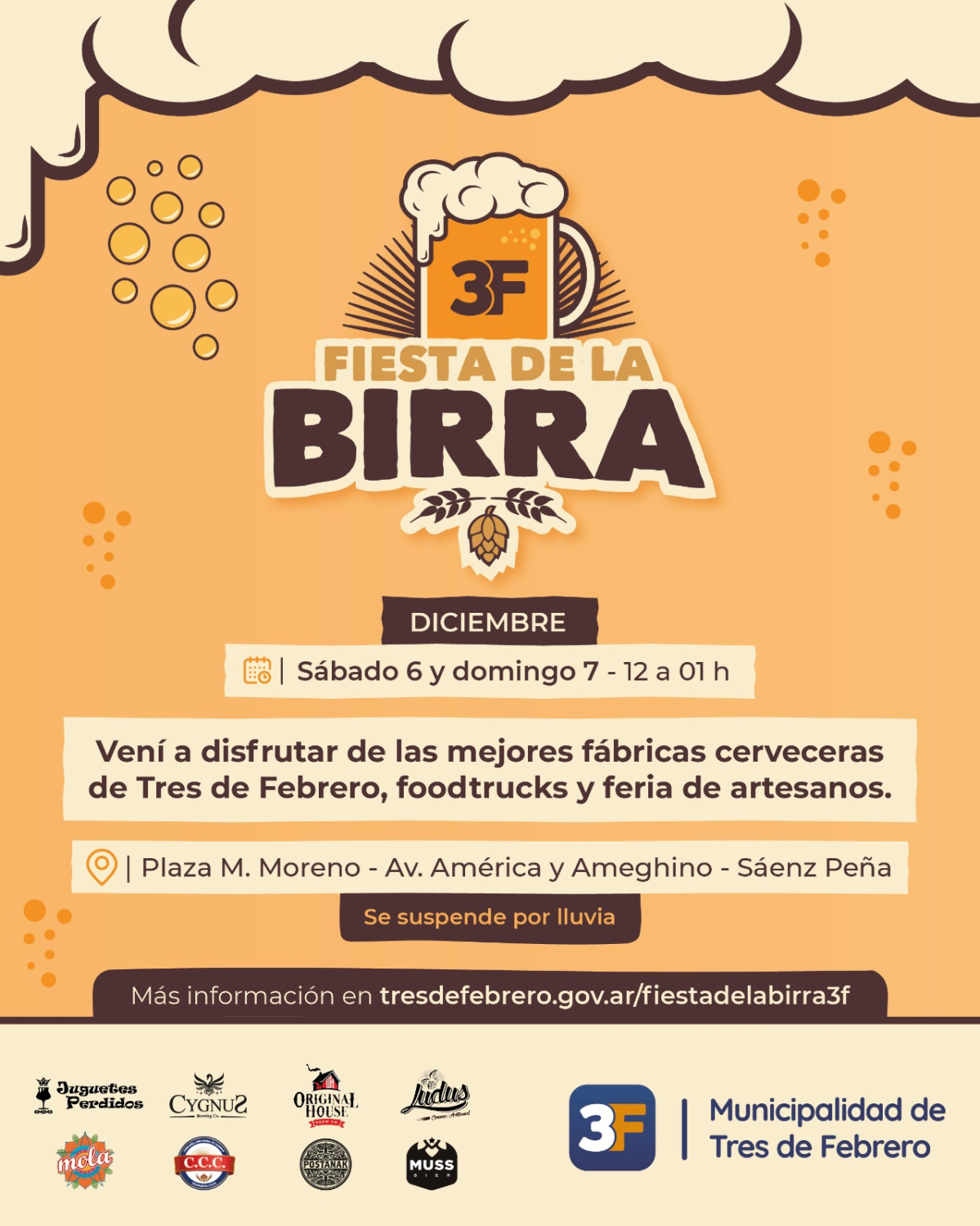 Las mejores cervecerías de Tres de Febrero, te invitan a cerrar el año con una nueva edición de la Fiesta de la Birra. La misma será el sábado 6 y domingo 7 de diciembre de 12 a 01 h en la Plaza. M. Moreno (Av. América y Ameghino). Además, el evento contará con diversidad de opciones gastronómicas y bandas tributo.