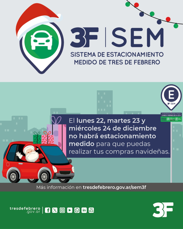 En algunas zonas de Tres de Febrero comenzará a implementarse el sistema en su fase de ordenamiento vial con demarcación de los lugares prohibidos para el estacionamiento, con presencia permanente de fiscalización pero sin cobrar por estacionar. Esto ocurrirá desde el 9 de noviembre en Ciudadela centro, Sáenz Peña y Santos Lugares. En estos barrios se valoró su condición de centros comerciales de abastecimiento local y se buscó fomentar la actividad comercial.