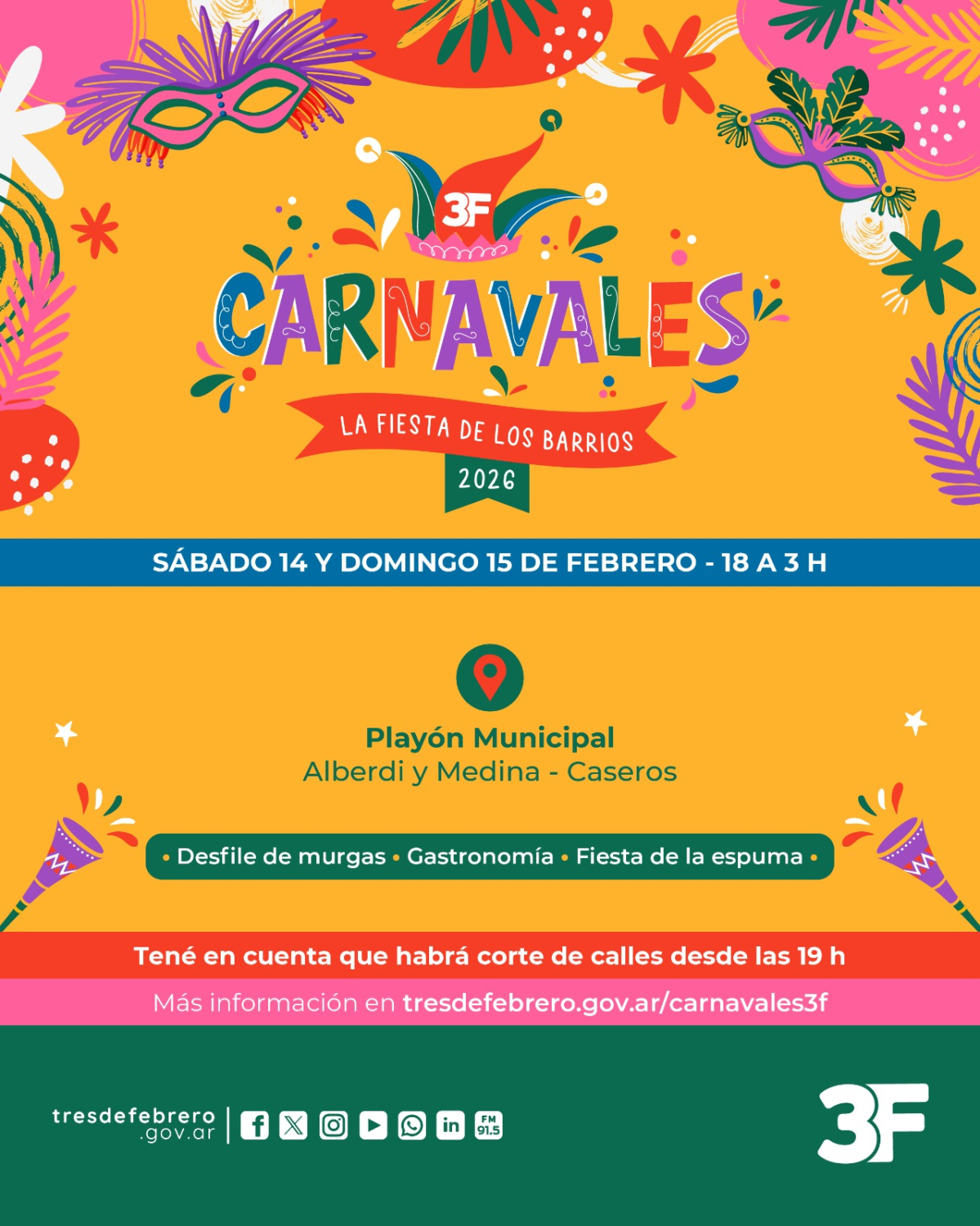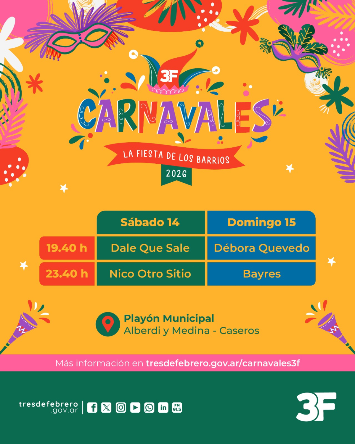 Los Carnavales son parte de nuestra identidad cultural, una tradición que reúne a vecinos, familias y amigos en una celebración única llena de ritmo y color. Por eso, te esperamos el sábado 14 y domingo 15 de febrero de 18 h a 3 h, en el Playón Municipal de Caseros (Alberdi y Medina).