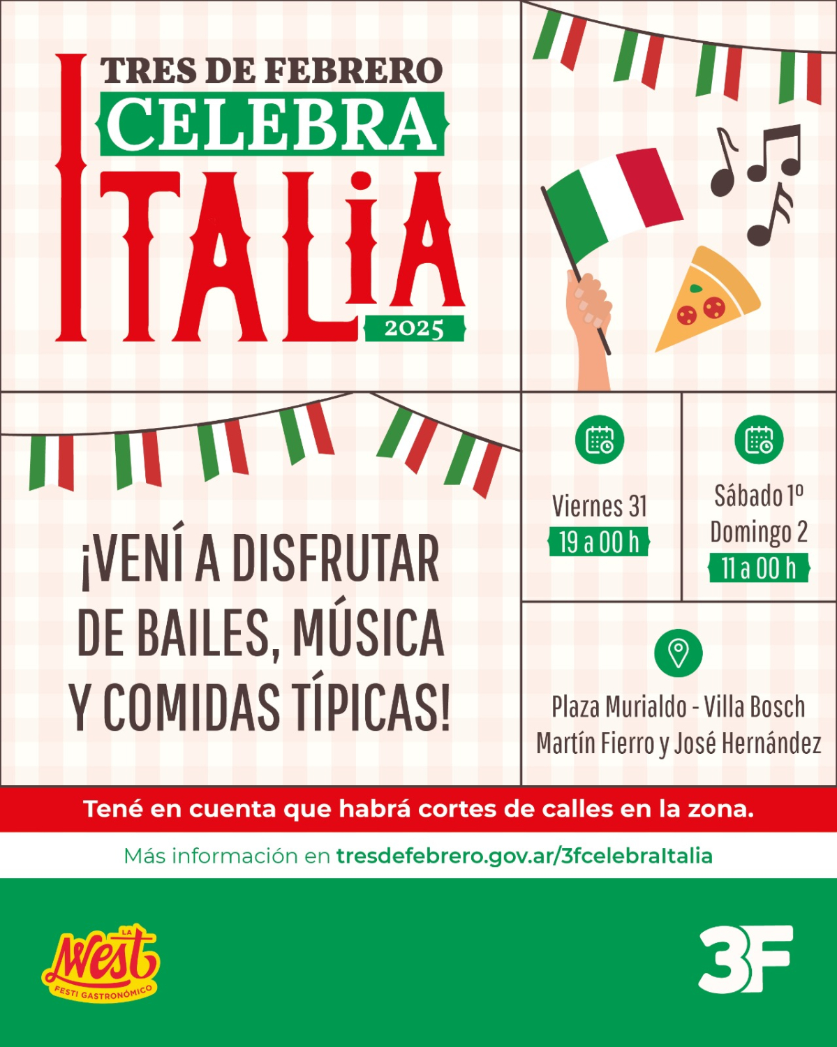 Los visitantes podrán deleitarse como cada año con gastronomía típica de las distintas colectividades italianas de Tres de Febrero y también habrá bailes y música en vivo. “Villa Bosch es el corazón de esta comunidad y es un orgullo celebrar su cultura y aporte con este evento tan importante”, expresó el Intendente Diego Valenzuela.
