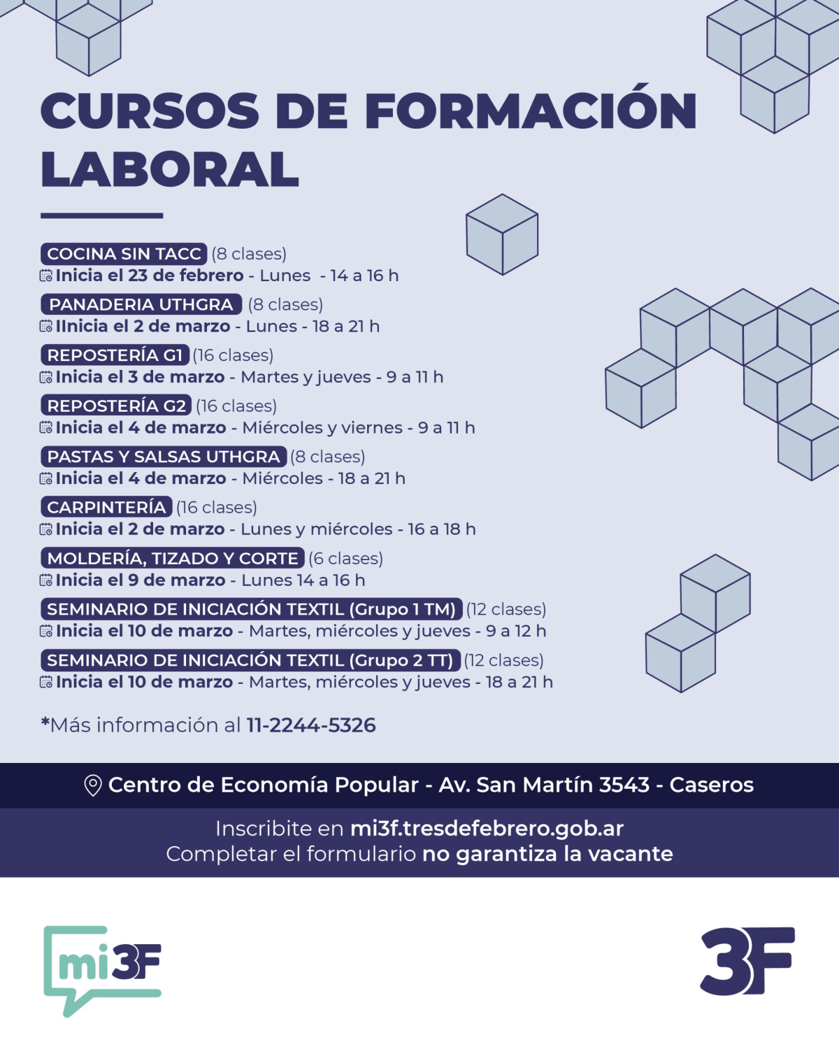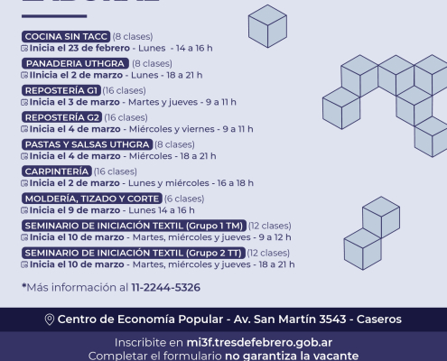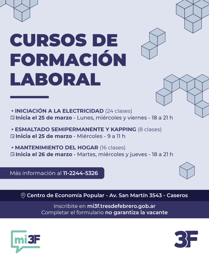 Tené en cuenta para para inscribirte a los cursos necesitás tener una cuenta en la plataforma MI3F. Además, contás con este número 11 2244-5326 para acceder a más información.