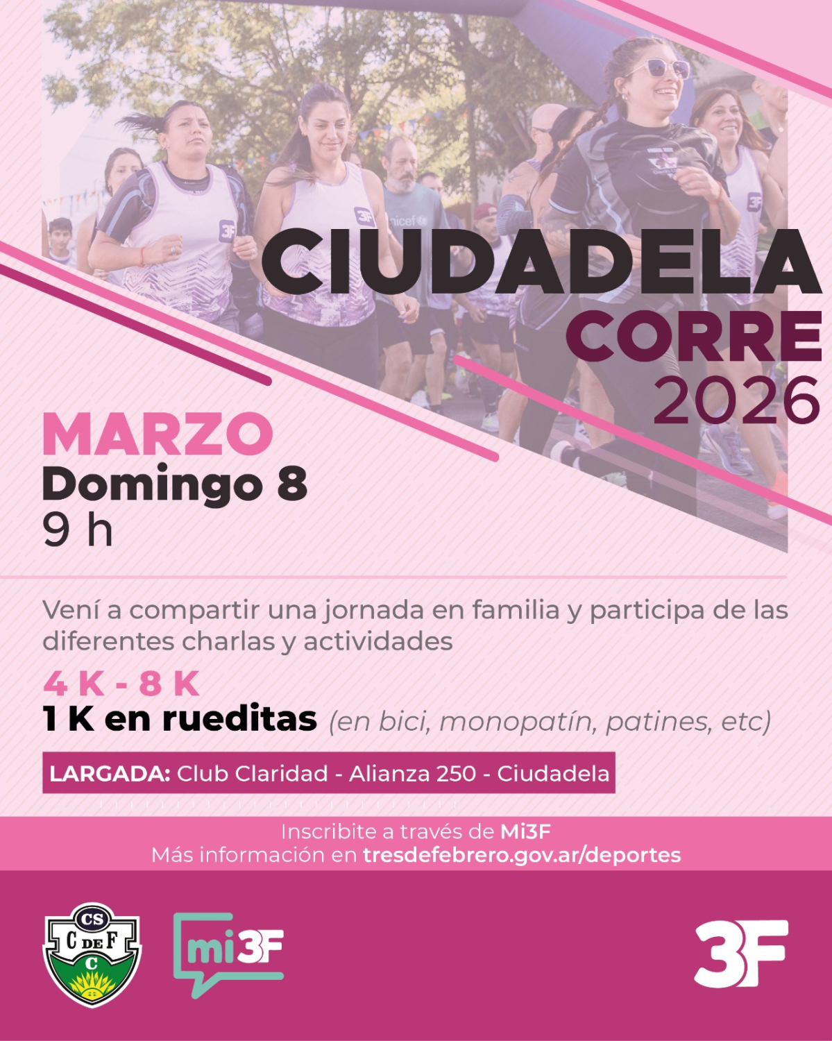 En cuanto a la competencia, su largada será desde el Club Claridad de Ciudadela (Alianza 250) y como todos los años, contará con distintos trayectos, de los cuales se podrán elegir entre 4 K (para mayores de 18 años, de 13 a 17 años con autorización de padre, madre o tutor) y 8 K (para mayores de 18 años), mientras que los más chicos tendrán la posibilidad de correr 1 K en rueditas (para chicos de 4 a 12 años), es opcional asistir con bici, monopatín y patines.