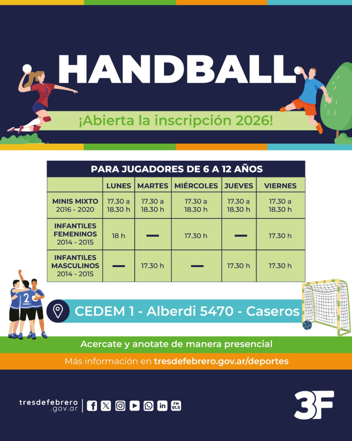 Queremos contarte que ya abrimos las inscripciones para distintas categorías de Handball. La propuesta está destinada a jugadores de 6 a 12 años. Anotalos de manera presencial acercándote al CEDEM 1.
