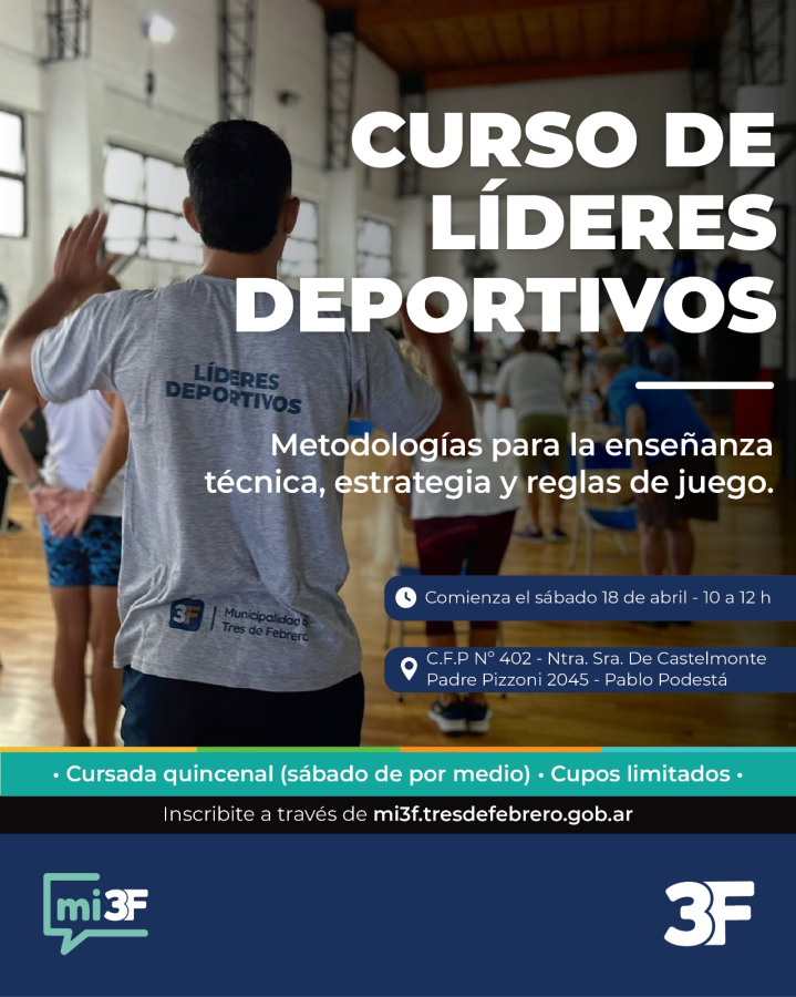 En el curso de líderes deportivos aprenderás metodologías de enseñanza deportiva, herramientas didácticas, y recursos pedagógicos. Es para mayores de 18 años y la modalidad es presencial, quincenal y sin costo. La inscripción la realizás a través de Mi3F.