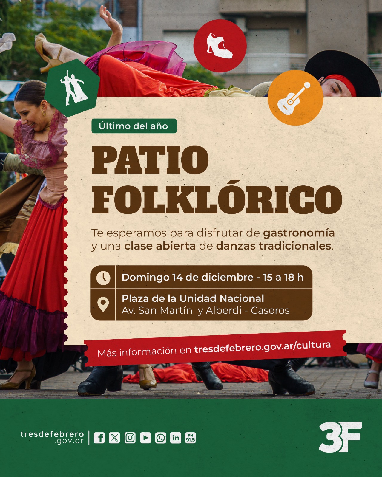 Fecha Dic 14 2025 Hora 3:00 pm - 6:00 pm Etiquetas Agenda Cultural,Destacada - Agenda Cultural PATIO FOLKLÓRICO Compartir este evento + Añadir Google Calendar Exportación + iCal / Outlook 00 días 00 horas 00 minutos 00 segundos