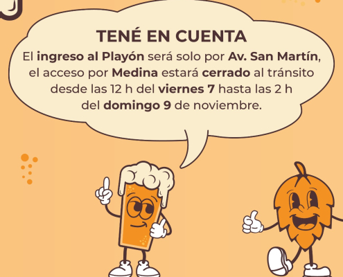 Tené en cuenta que el ingreso al playón será solo por Av. San Martín, el acceso por Medina estará cerrado al tránsito desde las 12 h del viernes 7 de noviembre hasta las 2 h del domingo 9 de noviembre.