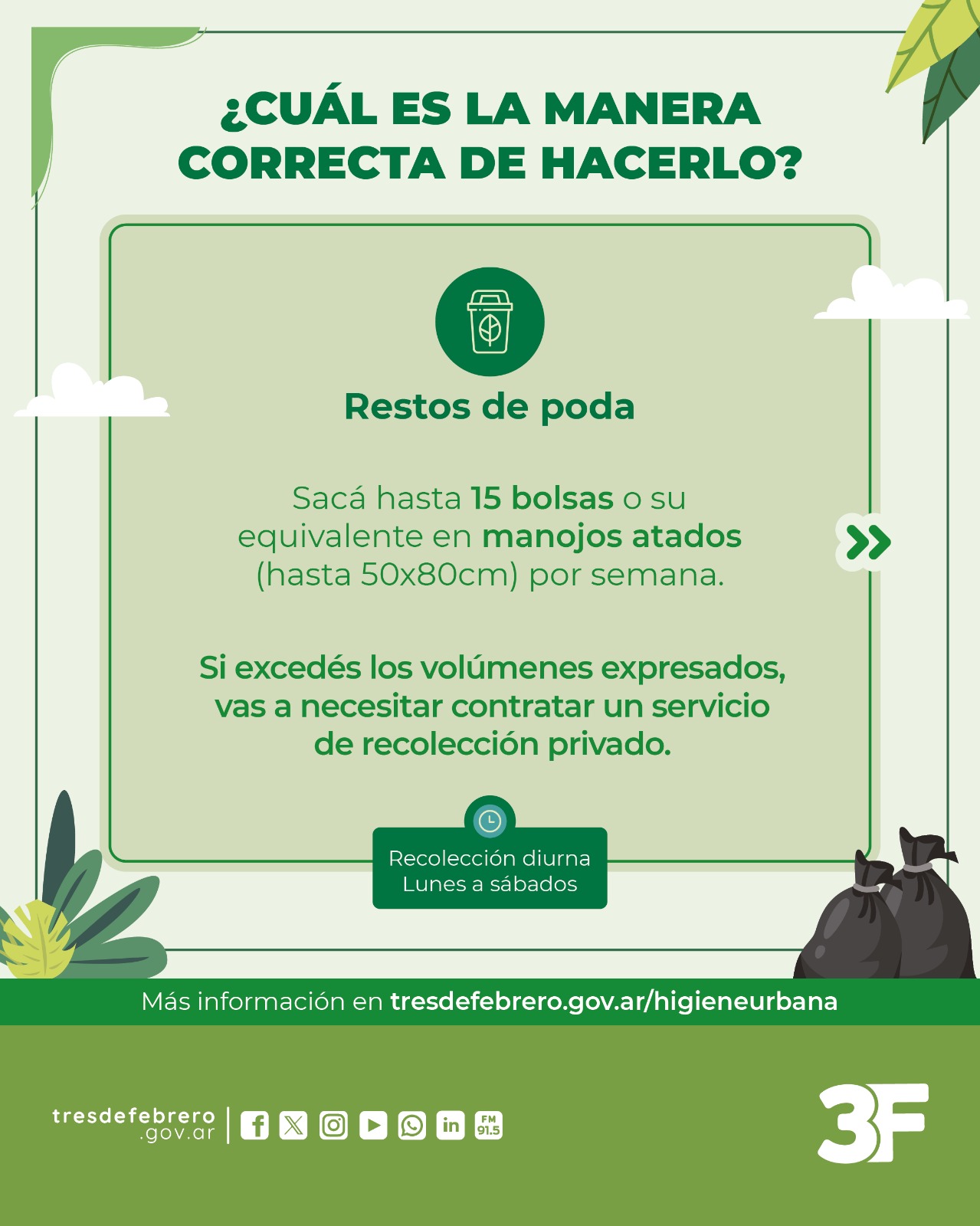 Podés sacar 15 bolsas o su equivalente en manojos atados de hasta 50×80 cm por semana sino debés contratar un servicio de recolección privado.