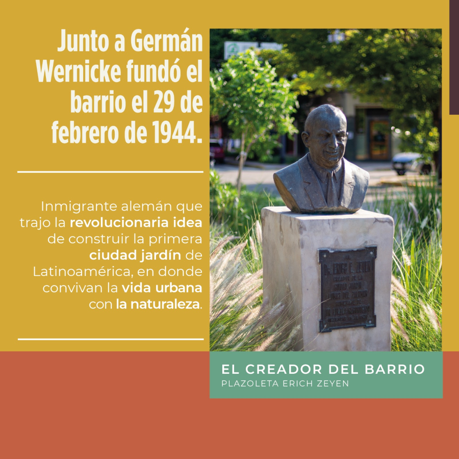 Frente al mural y recibiendo a quienes ingresan a Ciudad Jardín, encontramos el Busto del Dr. Erich Zeyen, inmigrante alemán que llegó en 1929 a nuestro país y que en 1944 proyectó “Crear una ciudad preconcebida y de desarrollo orgánico provista del confort de la gran urbe y con el encanto de la campiña”, puntapié para el nacimiento y desarrollo de Ciudad Jardín Lomas del Palomar. Sus restos descansan en la Capilla de San Roque.