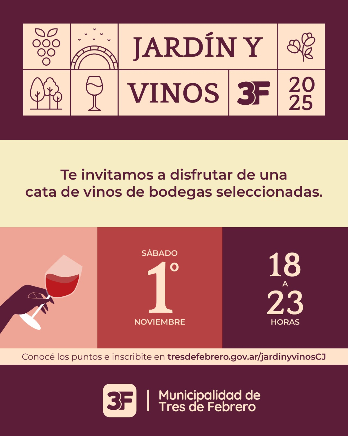 El sábado 1° de noviembre te esperamos de 18 a 23 h para disfrutar la 2° edición de «Jardín y Vinos 3F», una experiencia sensorial que combina lo mejor de esta bebida, exquisita gastronomía y el encanto de Ciudad Jardín. Más de 20 bodegas de distintas regiones del país estarán presentes para compartir sus cosechas con quienes quieran descubrir este mundo.