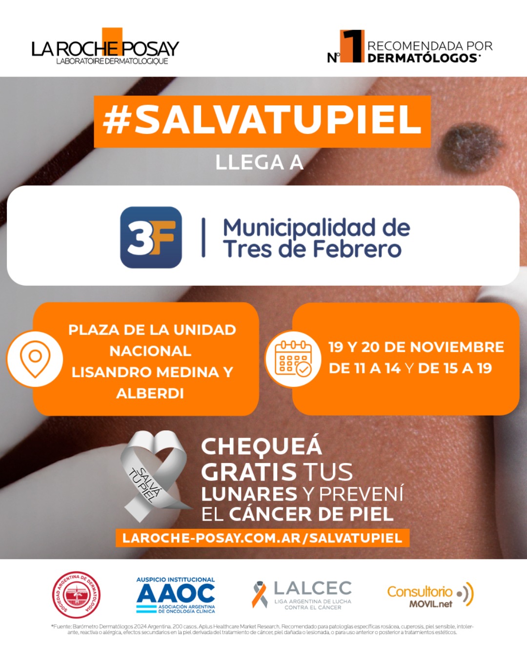La Roche-Posay llega a nuestro municipio con su campaña de concientización y prevención del cáncer de piel. Tanto el miércoles 19 como el jueves 20 de noviembre, vas a poder acercarte al consultorio móvil ubicado en la Plaza de la Unidad Nacional (Alberdi y Lisandro Medina) de 11 a 14 h y de 15 a 19 h, para ser atendido por dermatólogos profesionales que analizarán tus lunares. “Se viene el verano y la prevención es fundamental. El chequeo y los cuidados, como el protector solar, salvan vidas”, destacó el intendente Diego Valenzuela.
