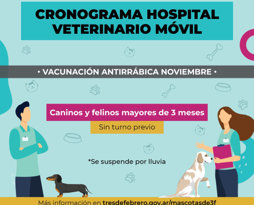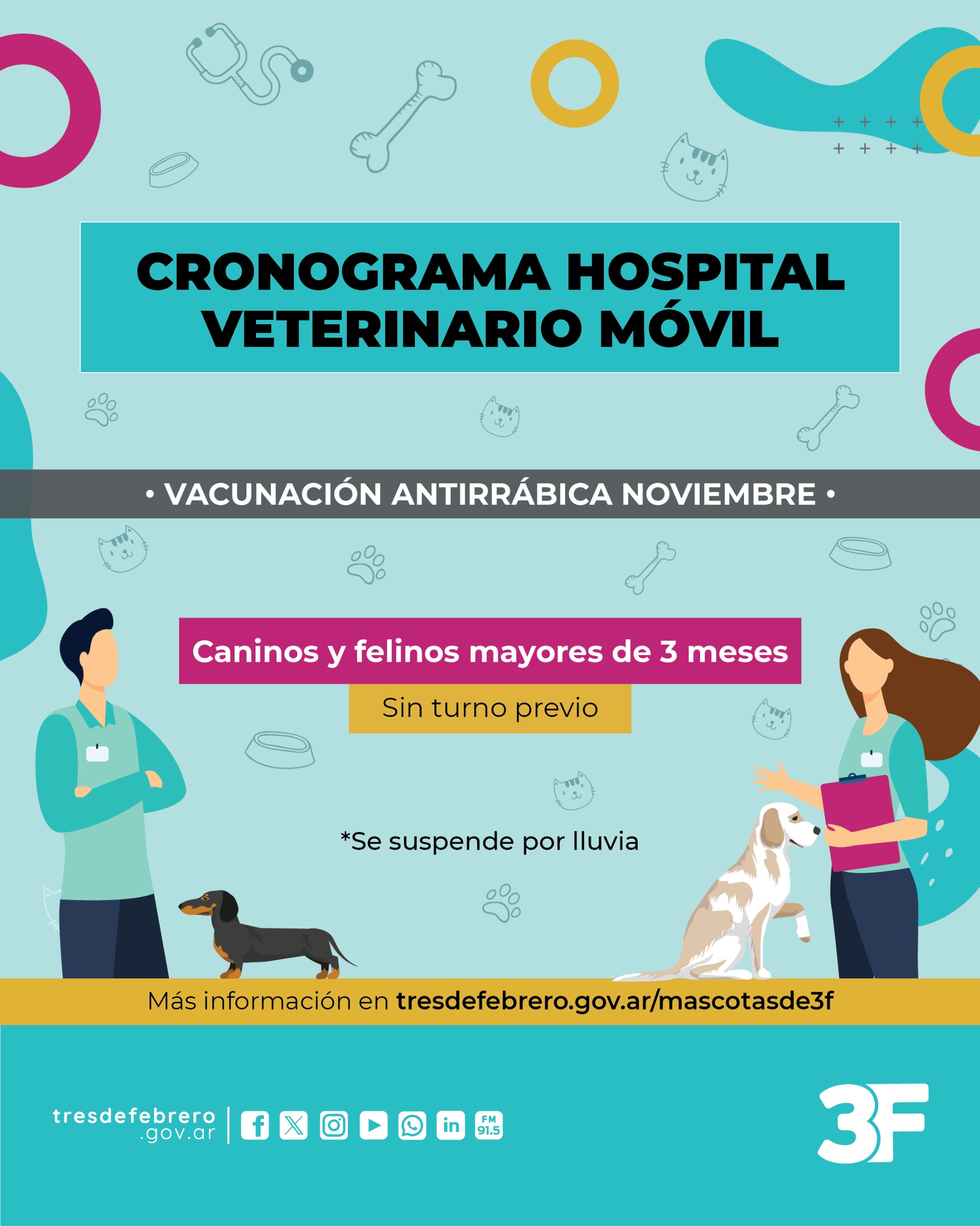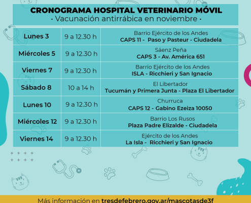 Te acercamos el cronograma de vacunación antirrábica correspondiente al mes de noviembre para que tu mascota pueda ser atendida. Recordá que para la vacunación debe tener más de tres meses de vida. Podés acercarte sin turno previo y la jornada se reprograma por lluvia.